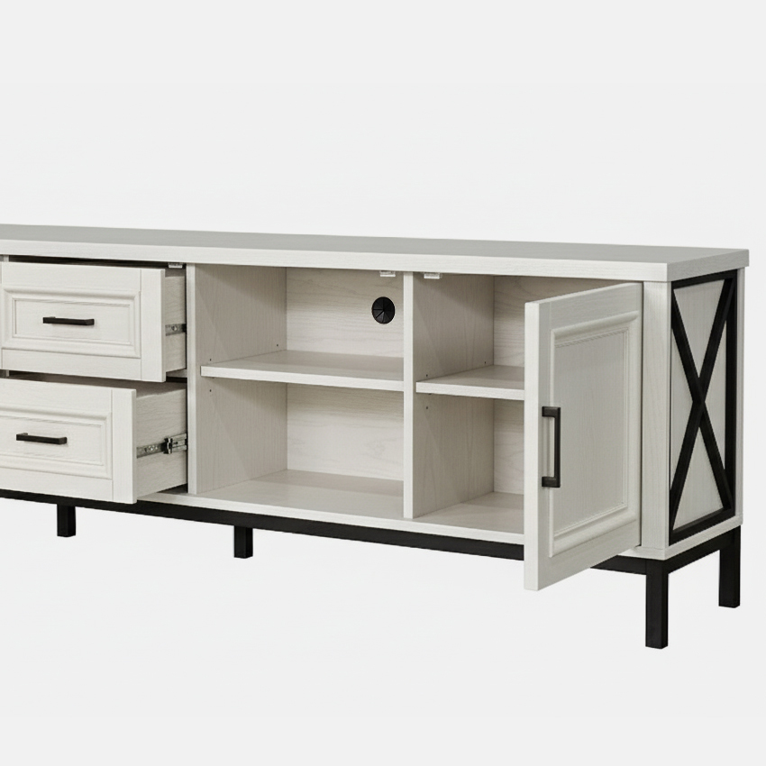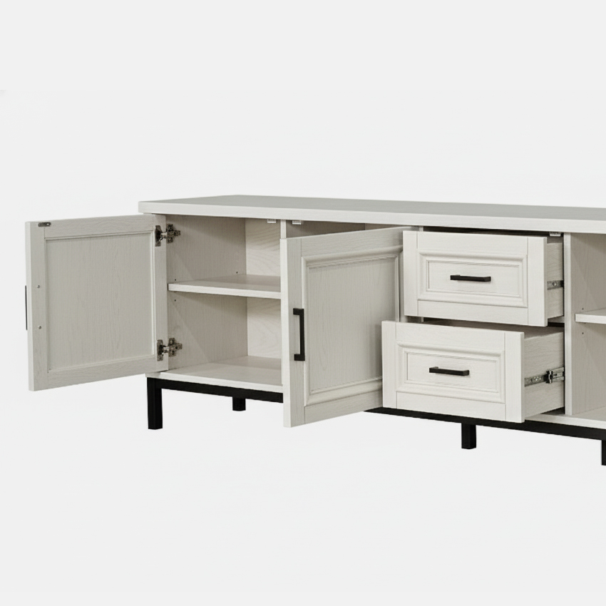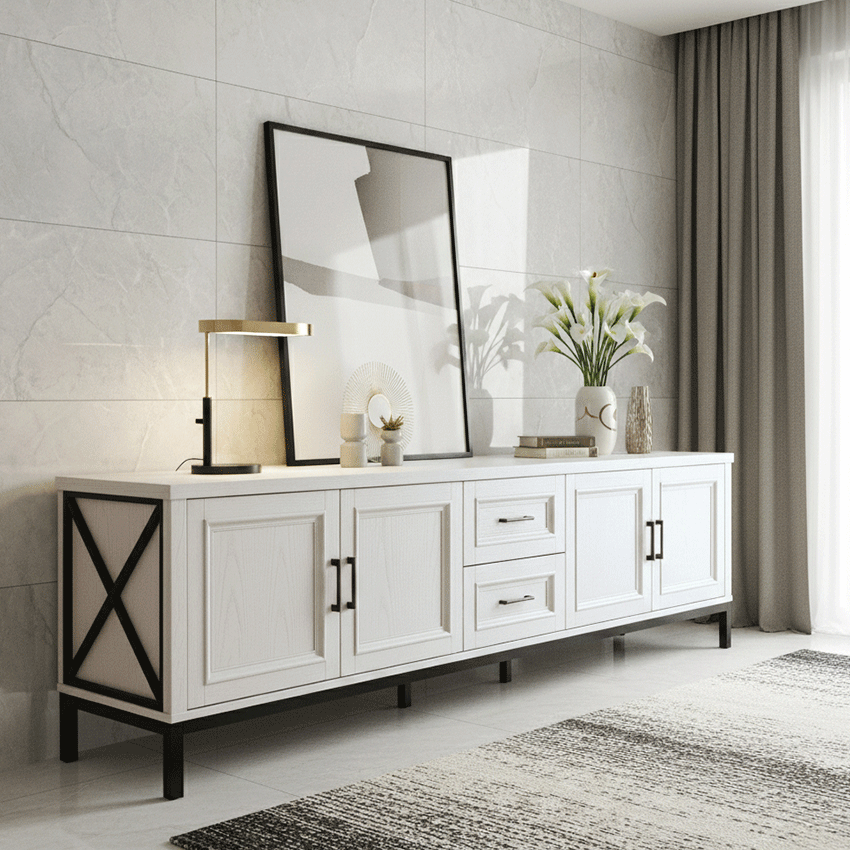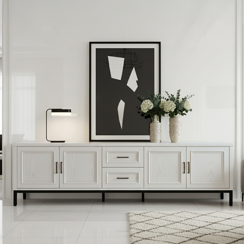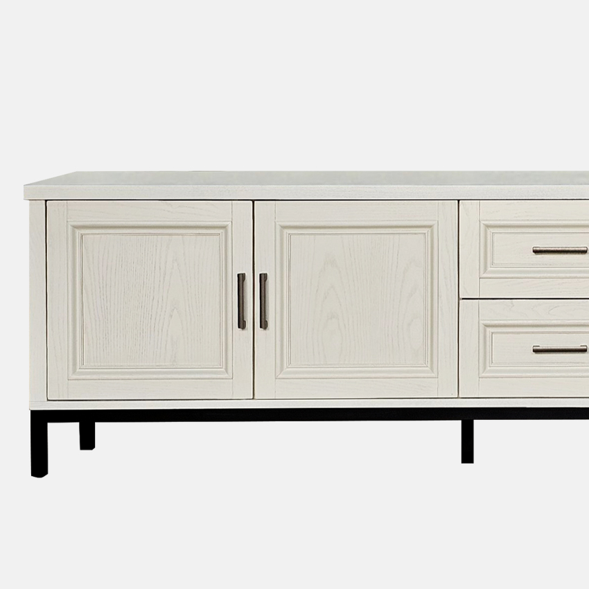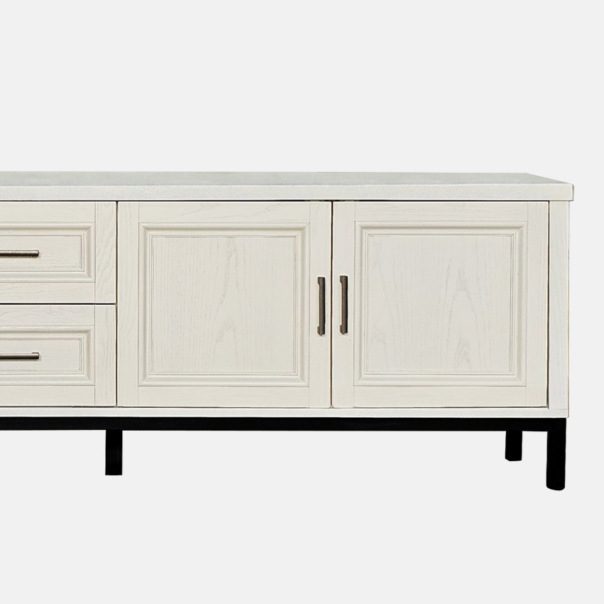 단순한 듯 보이지만 귀티나는 거실장입니다. 나뭇결이 은은하게 비치는 하얀 칠과 단아한 손잡이, 흰색과 대비되는 검정색 받침대, 옆면의 엑스자 받침 등이 어울려 품격있는 거실을 만들었네요. 토요일 길이 막혀 좀 늦었지만 끝까지 책임있게 설치하시고 뒷처리까지 깔끔하게 마무리해주셔서 감사합니다. 거실장 때문에 다른 가구들도 미라지 알아보고 있습니다.